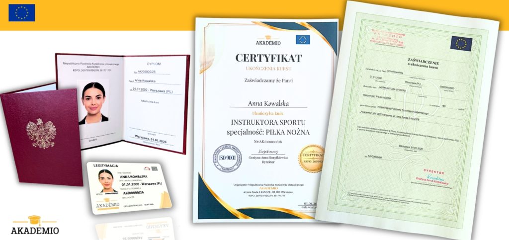 Jako absolwent otrzymujesz dokumentację, która jest potwierdzeniem ukończenia przez Ciebie kursu instruktora sportu o specjalności: piłka nożna; zgodnie z rozporządzeniem Ministra Pracy i Polityki Społecznej z dnia 13 czerwca 2013 r.; ustawą o sporcie z dnia 25 czerwca 2010 r. oraz ustawą Prawo Oświatowe z dnia 14 grudnia 2016 r.