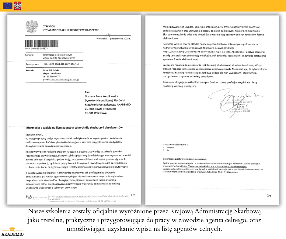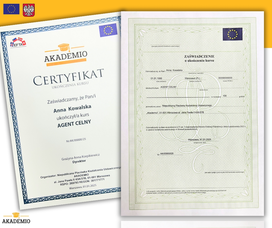 Dokumentacja w cenie kursu agenta celnego zawiera: