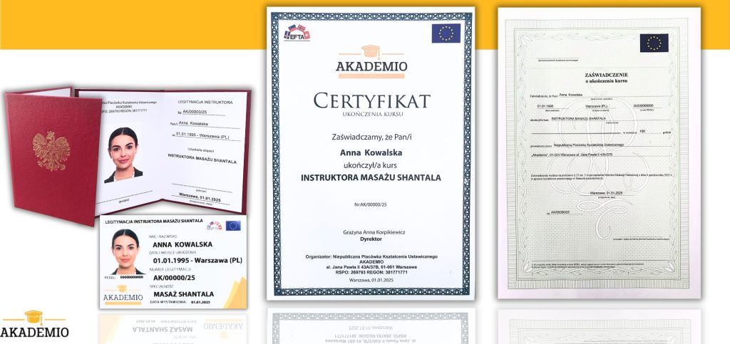 Dokumentacja w cenie kursu instruktora masażu shantala zawiera: