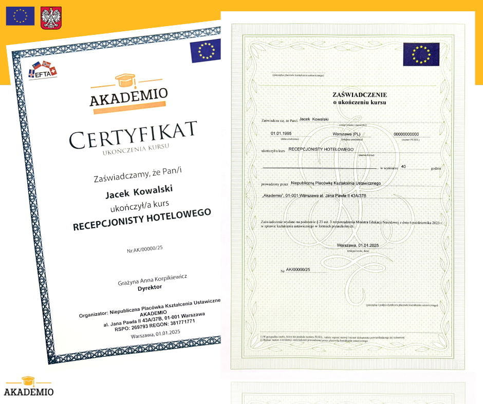 Jako absolwent kursu otrzymujesz dokumentację, która jest potwierdzeniem ukończenia przez Ciebie kursu recepcjonista hotelowy; zgodnie z rozporządzeniem Ministra Pracy i Polityki Społecznej z dnia 13 czerwca 2013 r.; oraz ustawą Prawo Oświatowe z dnia 14 grudnia 2016 r.