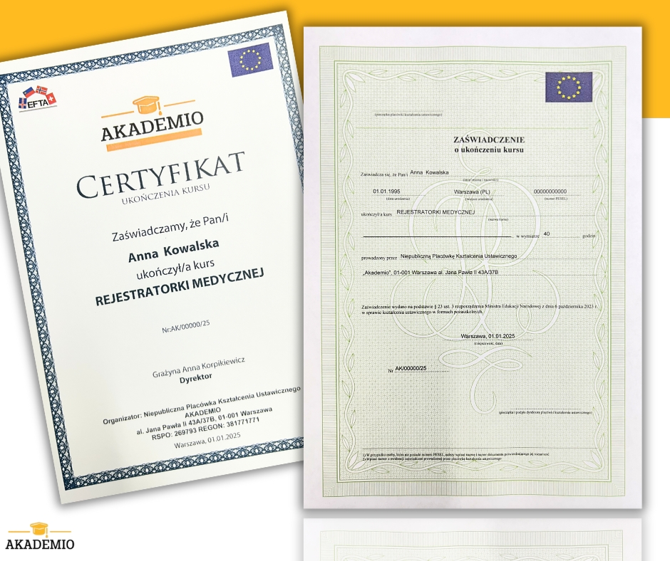Jako absolwent otrzymujesz dokumentację, która jest potwierdzeniem ukończenia przez Ciebie kursu rejestratorki medycznej; zgodnie z rozporządzeniem Ministra Pracy i Polityki Społecznej z dnia 13 czerwca 2013 r.; oraz ustawą Prawo Oświatowe z dnia 14 grudnia 2016 r.